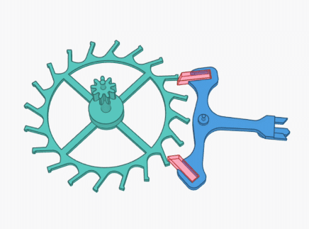 擒縱叉本身是由金屬製成,但請注意其末端的兩個粉紅色透明部分,他們是由合成紅寶石製成的。這種化合物不僅非常堅硬,可以防止磨損,而且與鋼的摩擦係數也很低。我們可以通過觀察這兩個組件如何相互作用來了解為什麼這些屬性很重要: