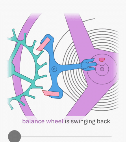 隨著擺輪擺動,圓盤釘撞擊擒縱叉,從而解鎖擒縱輪。一旦解鎖,由主發條驅動的擒縱輪推動擒縱叉,擒縱叉通過圓盤釘推動擺輪本身。這會導致擺輪獲得一些能量,從而防止它在一段時間後停止——這相當於推動一個正在鞦韆上擺動的人。當擺輪迴來時,它執行相同的動作,只是在另一個方向。