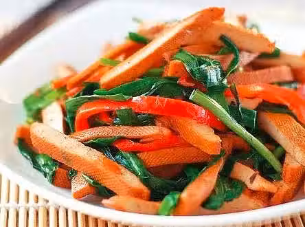 2、炒鍋加油燒熱,下紅椒絲和香乾翻炒,加入少許鹽、生抽調味,如果太干可加入少許水;
