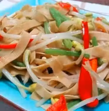 1千張切絲,放入滾水中焯一-下,用涼水衝過。黃豆芽摘凈,芹菜切絲。
