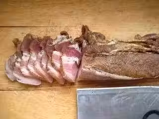 9. 三天後,將醃好的五花肉取出,一半切成片。