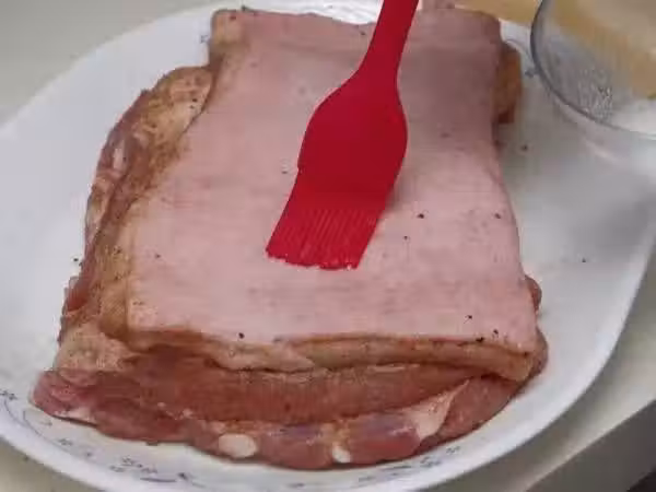 皮上掃2層上皮料,剩下的上皮料留用。把豬肉放入冰箱腌過夜。同時把烤箱設"蒸汽烘焗"功能,預熱200度。