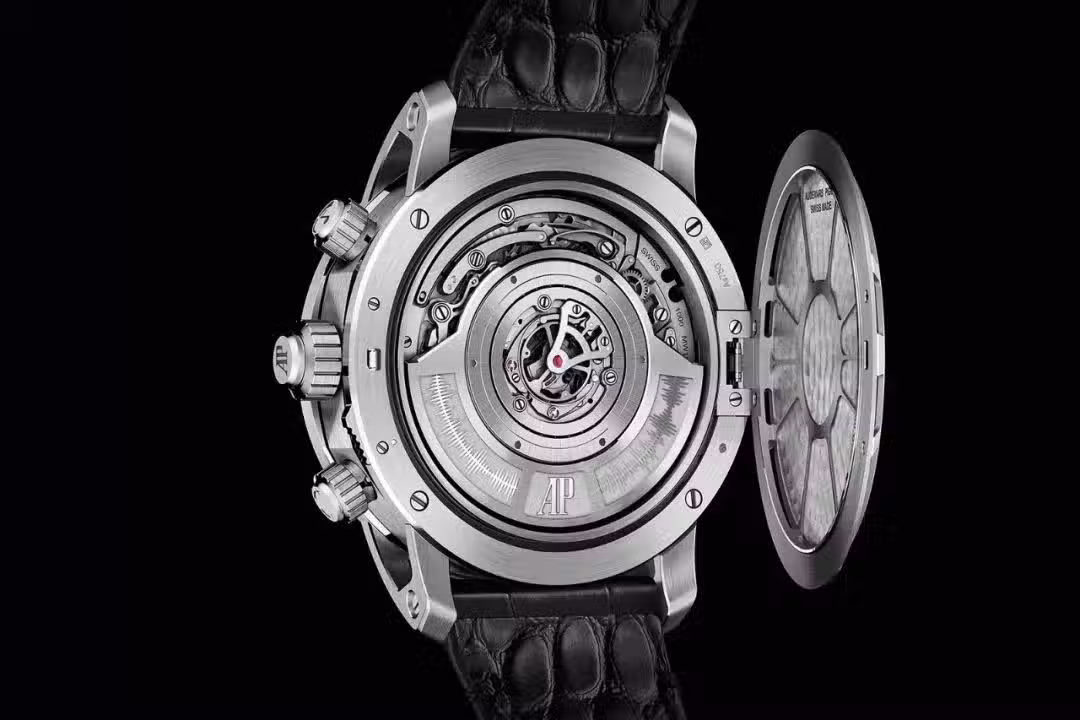 為了實現可佩戴性,愛彼創新性提出了「同軸自動陀」技術。通常追針疊加在計時功能上,如果再增加自動陀,那麼機芯就會賊厚。而愛彼將自動陀做出了介於邊緣+中置的結合,這樣就可以讓追針結構和自動陀處於同一個平面,節約出空間。