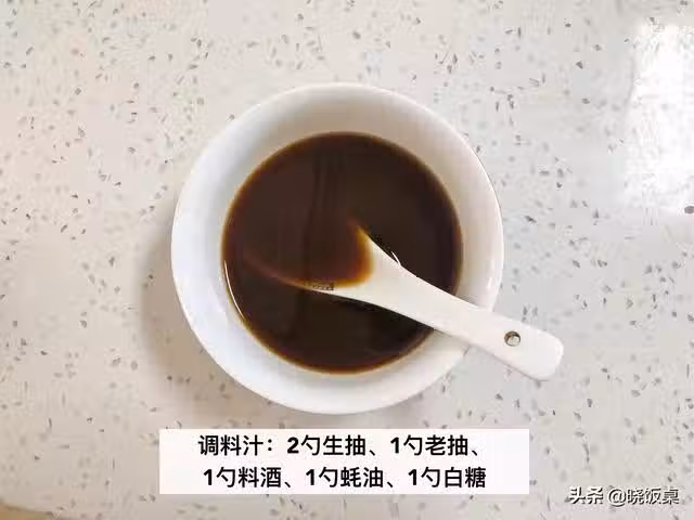 1、調料汁,根據下圖比例,在碗中分別加入生抽、老抽、料酒、蚝油以及白糖攪勻備用。