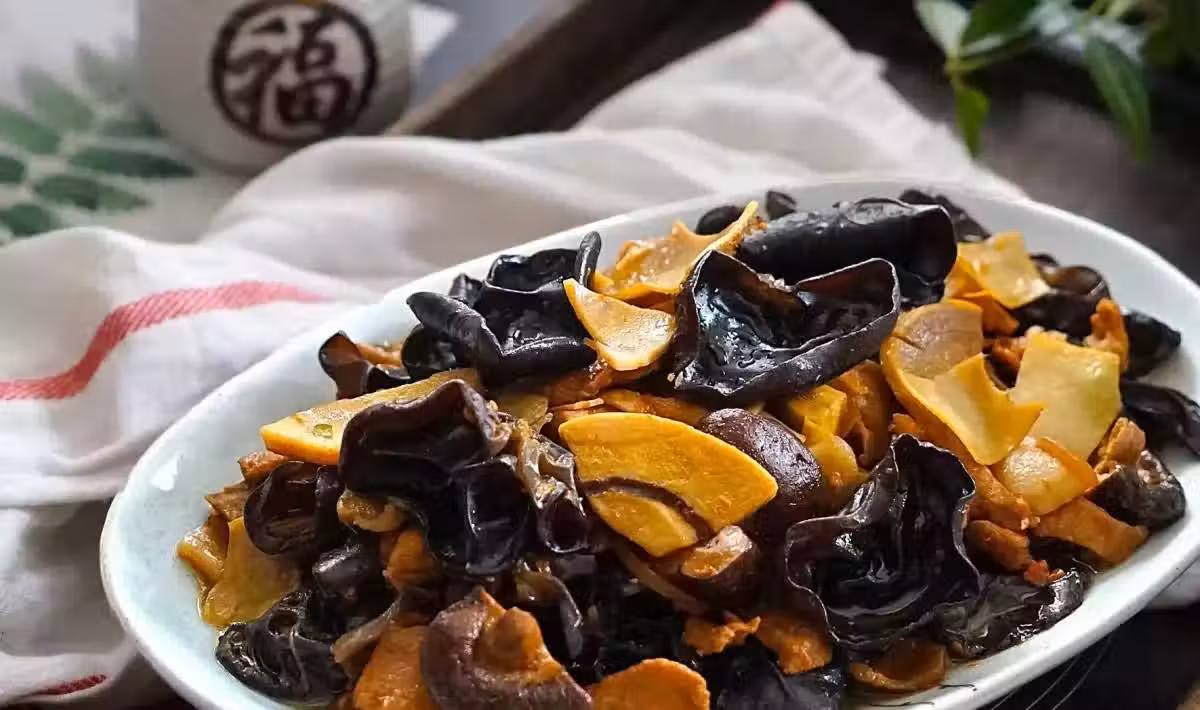 【食材準備】豬肉100克、黑木耳30克、泡發的香菇2個、春筍280克、鹽1茶匙、雞精少許、生抽2勺