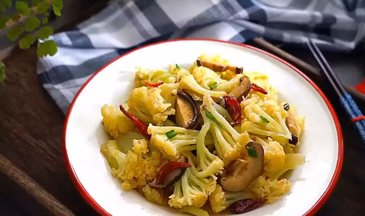 4、再放入花菜、香菇、鹽、紅辣椒、雞精一起翻炒2分鐘,再蓋上鍋蓋燜2分鐘