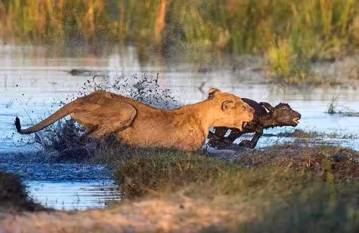 18歲老母獅「不服老 打頭陣」狩獵小牛,慘被母野牛反擊,雖然收穫了小牛晚餐,老母獅卻再沒力氣吃了