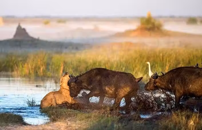 這只母獅已經沒有時間去琢磨為何翻轉如此之快,它迅速轉身,竭盡全力想要逃出母牛的進攻范圍,而身後那隻救子心切的母親,顯然不打算就此放過它,又接連給了母獅幾下。老母獅最終還是得以擺脫母牛的追逐並回到了自己的獅群中。