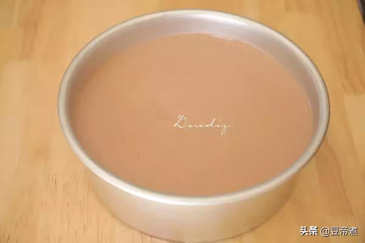 8、把麵糊從高一點的地方緩緩倒入盆中,此時的蛋糕糊狀態應該為絲滑帶狀。全部倒入之後記得把盆中剩餘的刮乾淨一併倒入,然後拿起模具左搖右晃震動幾下。震出蛋糕糊中的一些大氣泡,此時就能放入烤箱中進行烘烤了。