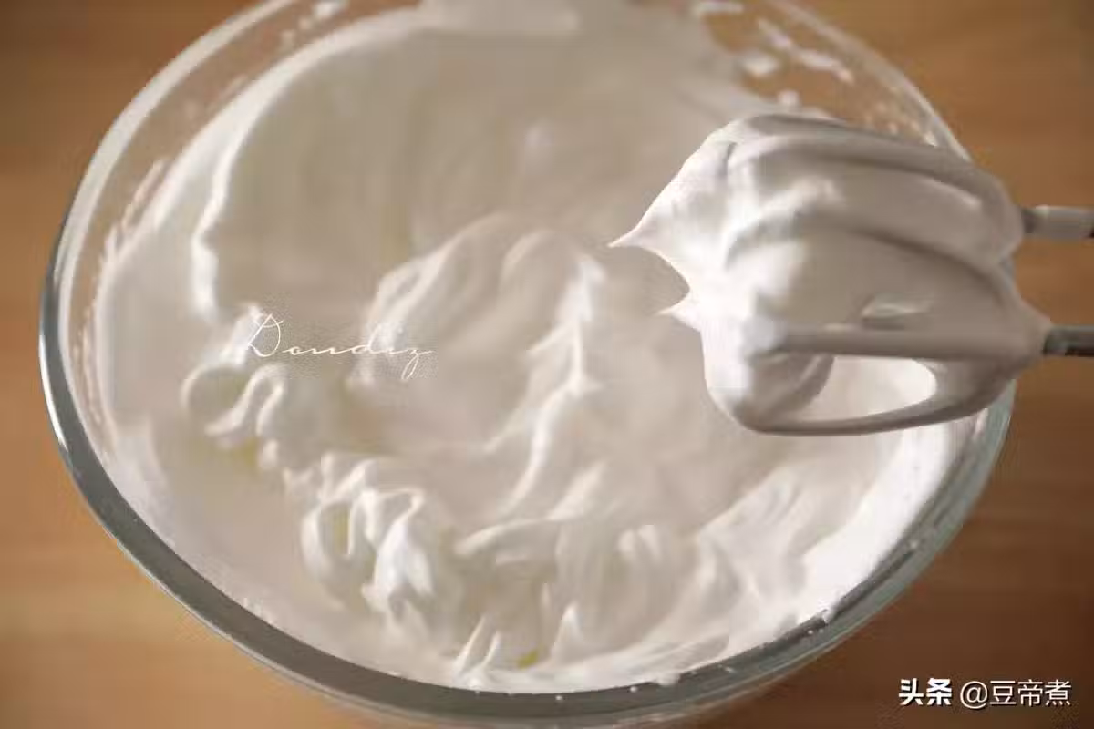 5、打發幾下呈「魚眼發泡」加入三分之一的細砂糖,接著繼續打發至起紋理再加入三分之一的細砂糖。還得繼續打發至「濕性發泡」倒入剩餘的三分之一細砂糖,最後打發至「硬性發泡」也就是提起打蛋器有一個硬性的尖角。