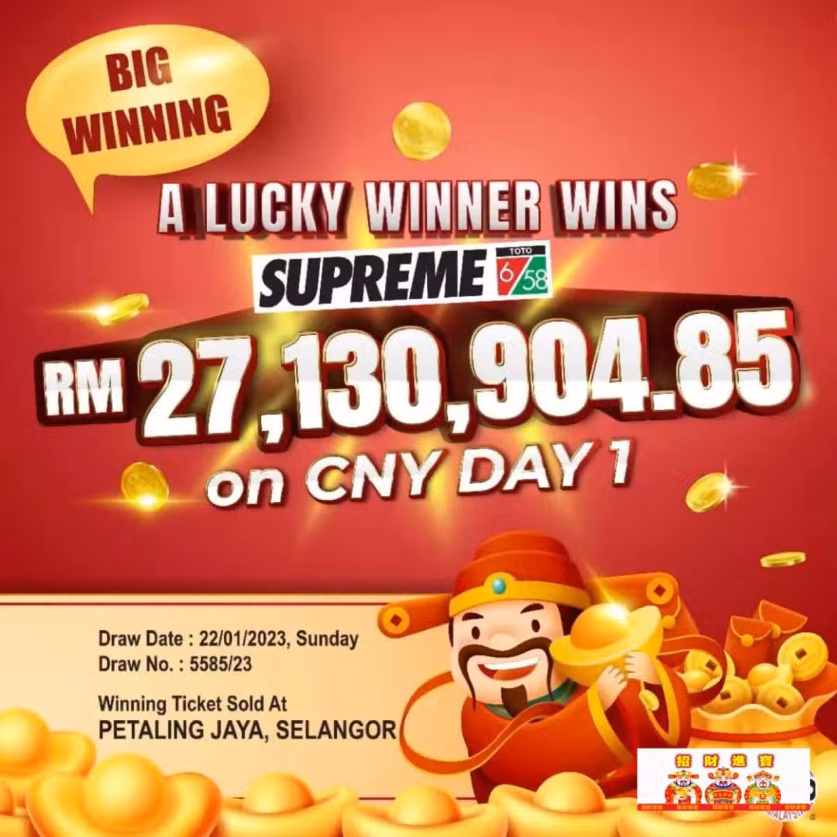由於他是以「電腦幸運選字」玩法投注,因而憑其中獎號碼組合── 1、3、30、32、36及46擊中積寶獎項,抱走總值2713萬零904令吉85仙的獎金。他表示會與妻子和女兒分享這筆獎金。 此外,大彩第14/22期(開彩日期:2022年10月16日)開彩一個月後,三獎得主方現身領獎,該期三獎彩票號碼5432481,獎金為20萬令吉。 此期幸運兒來自柔佛居鑾的江小姐,是一名80後的上班族。 在訪問中,大彩工作人員得知江小姐平日並沒有投注或買彩票的習慣。此次購買全因與母親去早市路經大馬彩投注站看見大彩彩票,母親即興鼓勵女兒購買數張彩票試試運氣之餘,也能幫助慈善機構。 江小姐表示:當天會購買彩票,也是因為母親平日有購買的習慣,並讓她嘗試手運,因此就買了幾張。 「沒想到開彩後數天,就接到母親電話說『好像中獎了!』,經過查詢成績才真的確認中獎!」