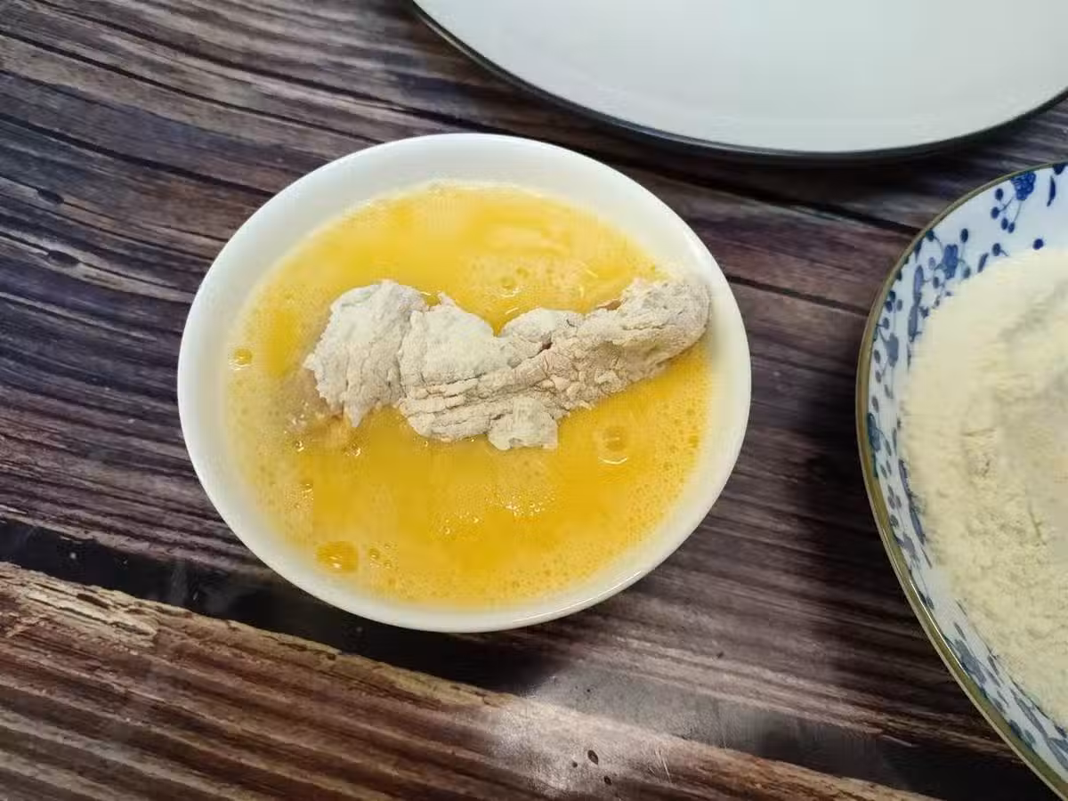 6、把裹上雞蛋液的雞翅根再次放入盤子裡,表面再裹一層炸雞裹粉,然後抖掉表面多餘的裹粉,就可以準備下鍋炸了。