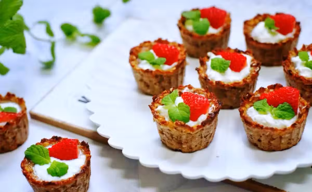 3、出爐取出燕麥杯放涼,倒入暢輕纖酪乳,放上草莓碎、藍莓裝飾