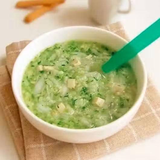 3、大米洗凈熬粥,加入適量雞湯,雞肉燉至粥黏稠狀加入芹菜末在燉十分鐘即可。