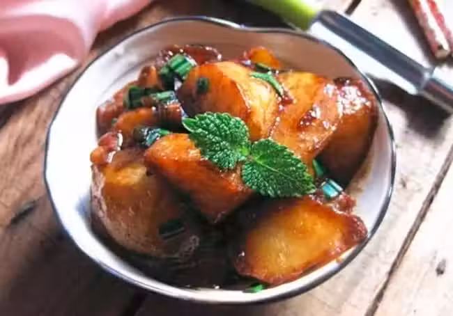 土豆350克,大蒜葉2根,色拉油40克,生抽1勺,老抽1勺,蚝油1勺,白砂糖2/3勺,清水10勺。