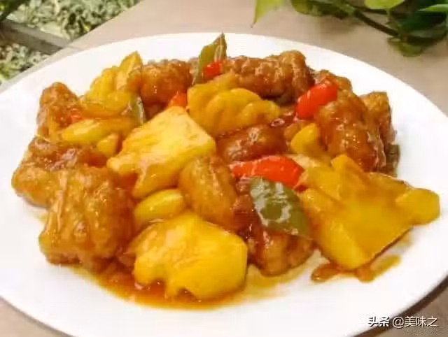 7、倒入青紅黃椒、炸好的五花肉塊、菠蘿,翻炒至各物裹上醬汁;再用生粉加水勾個薄芡,即可上碟。