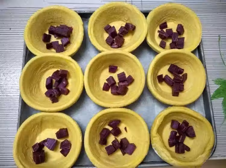 2、將蛋撻皮放烤盤裡,紫薯塊放撻皮里;