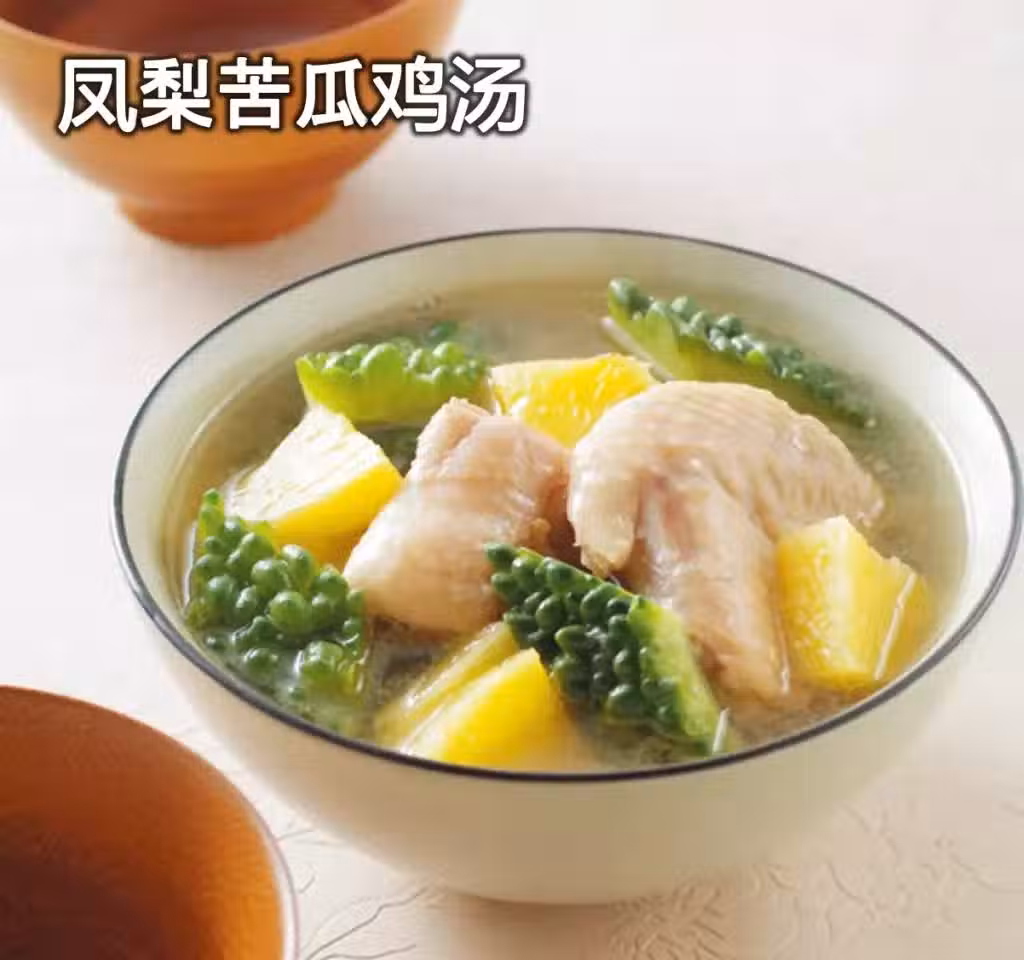 材料:仿土雞塊 300公克,苦瓜 200公克,咸鳳梨 5塊,薑片 3片,米酒 1大匙,水 500cc, 鹽 ¼茶匙