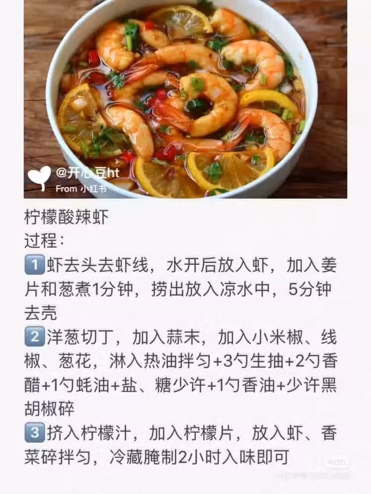 材料:鮮蝦,姜,大蔥,料酒,大蒜,洋蔥,小米辣,芝麻,生抽,醋,蚝油,細砂糖,胡椒粉,檸檬片,百香果1個