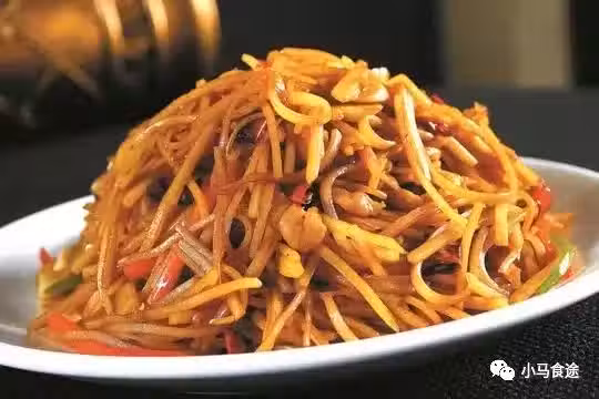 材料:土豆絲、生抽醬油、老抽醬油、鹽、味精、花椒粉、生薑粉、蔥絲、菜籽油、可配青椒絲。