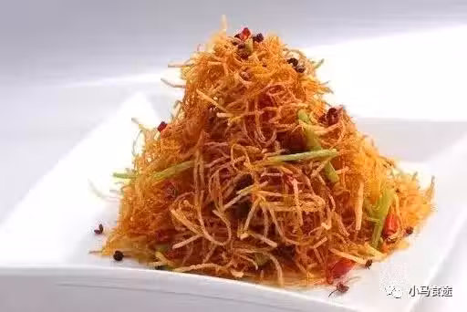 1.土豆絲洗凈之後,瀝干水分,裹上少許干澱粉拌勻,即可下到六成熱的油溫中炸至金黃,撈出備用。