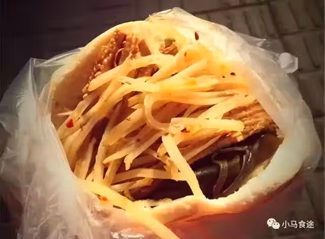 7.烙好的餅趁熱劃開口子,將炒好的醬香雞肉土豆絲夾在裡面,雞肉土豆絲夾餅就做好了。