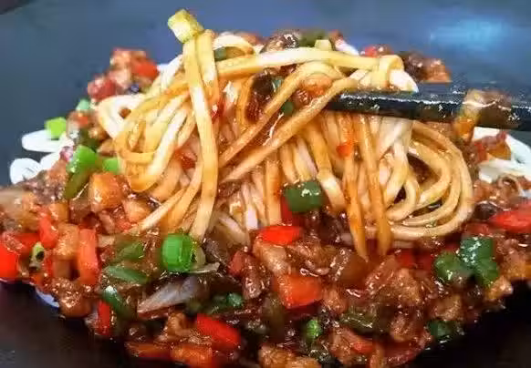 食材: 面條、豬肉、青紅尖椒、 蒜、姜、食用油、醬油、鹽、香油