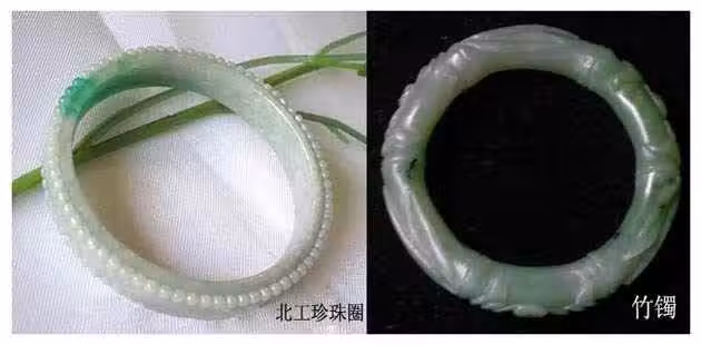 六、各式工鐲:這個花樣就多了,一般是為了一個鐲子上出現多種顏色,但是玉種不算上乘,所以有工力的匠人就隨俏色做出各種吉祥寓意,龍鳳搶珠啦,連年有餘(蓮葉鯉魚)啦,福在眼前啦(蝙蝠或蝴蝶和銅錢),玉堂富貴(海棠牡丹)啦。一般因為內圈要貼手腕,所以內圈不上工,省得硌手;為了湊顏色,所以鐲子或扁或圓也沒有定規。這種工鐲做到極至,蘇工可用軟玉做出鏤空花樣,北工可在鐲子條杆兩邊整圈雕出精圓珍珠邊,這就純粹買工了。