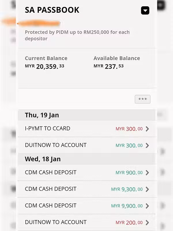 據貼文照片顯示,網民的戶頭是在今年1月18日(周三)接到有關3筆藉由存款機(CDM)匯入的款項,分別為9900令吉、9300令吉和900令吉。