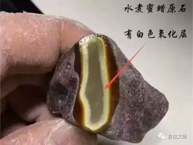 3、水煮蜜蠟顏色晦暗,烏突突的沒有光澤,放大看顆粒感明顯。