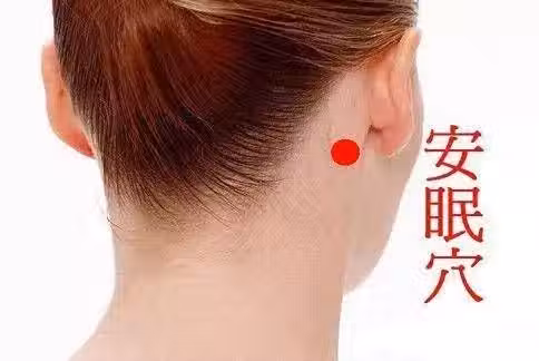 安眠穴位於當風池穴(在後頸部,後頭骨下,兩條大筋外緣陷窩中,與耳垂齊平)與翳風穴(在耳垂後方,當乳突與下頜角之間的凹陷處)連線的中點就是安眠穴。