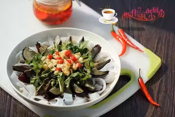 皮蛋2個、涼粉1卷.香菜3根、生抽1勺、香醋1勺、紅辣椒2個、辣椒油 2勺
