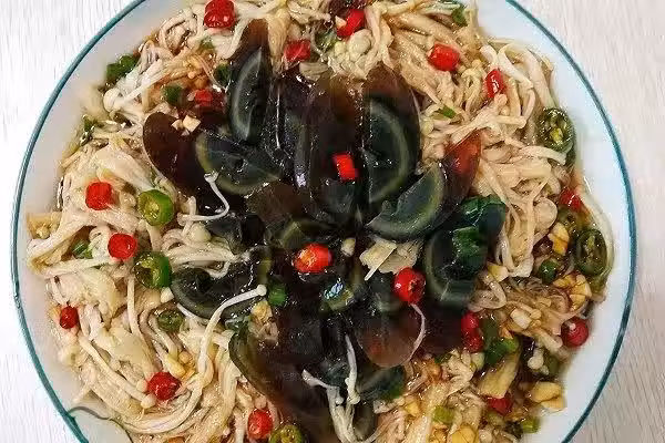 1. 金針菇撕小朵洗凈鍋中加適量鹽煮熟放盤中,皮蛋切塊放盤中,蔥,青線椒,小米椒切小段,蒜切沫放小碗中,加入適量糖,醋,生抽,老抽,耗油,香油,攪拌均勻,鍋中燒油油溫六七成熱(平時炒菜的量就行了)倒入剛剛盛放蔥蒜小米辣的碗中攪拌均勻,在倒入金針菇盤中就可以了,非常開胃的一道涼菜