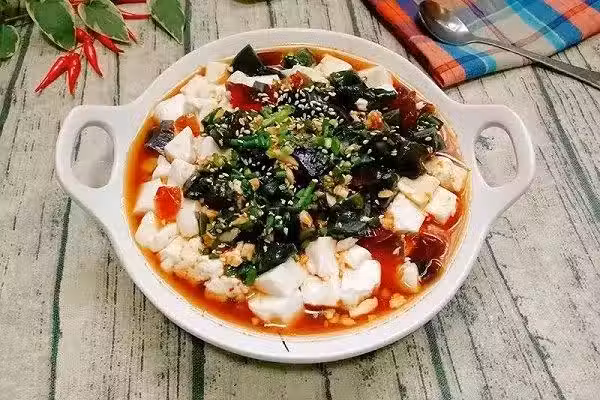 內酯豆腐一盒、生抽2湯匙、白糖1匙、醋2湯匙、鹽適量、蔥蒜適量、辣椒油依個人口味.皮蛋2個、熟白芝麻少量