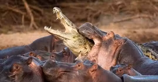 這些表面上看起來憨厚可愛的食草大河馬,實際上是出了名的暴脾氣,一直鱷魚不幸進入了河馬群的包圍,我想它已經沒有掙扎的必要了,河馬那鋒利的牙齒可以輕鬆穿透鱷魚的身體。如果是我,絕對不會冒險進入河馬的領地。