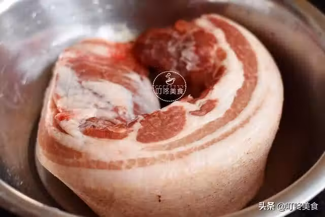 【做法】:第一步,首先把五花肉清理乾淨,豬毛和豬皮上的污垢都刮掉,切成15公分左右寬度的形狀,放入鍋中加入幾個八角煮一個小時(煮至豬皮可以用筷子戳破)。