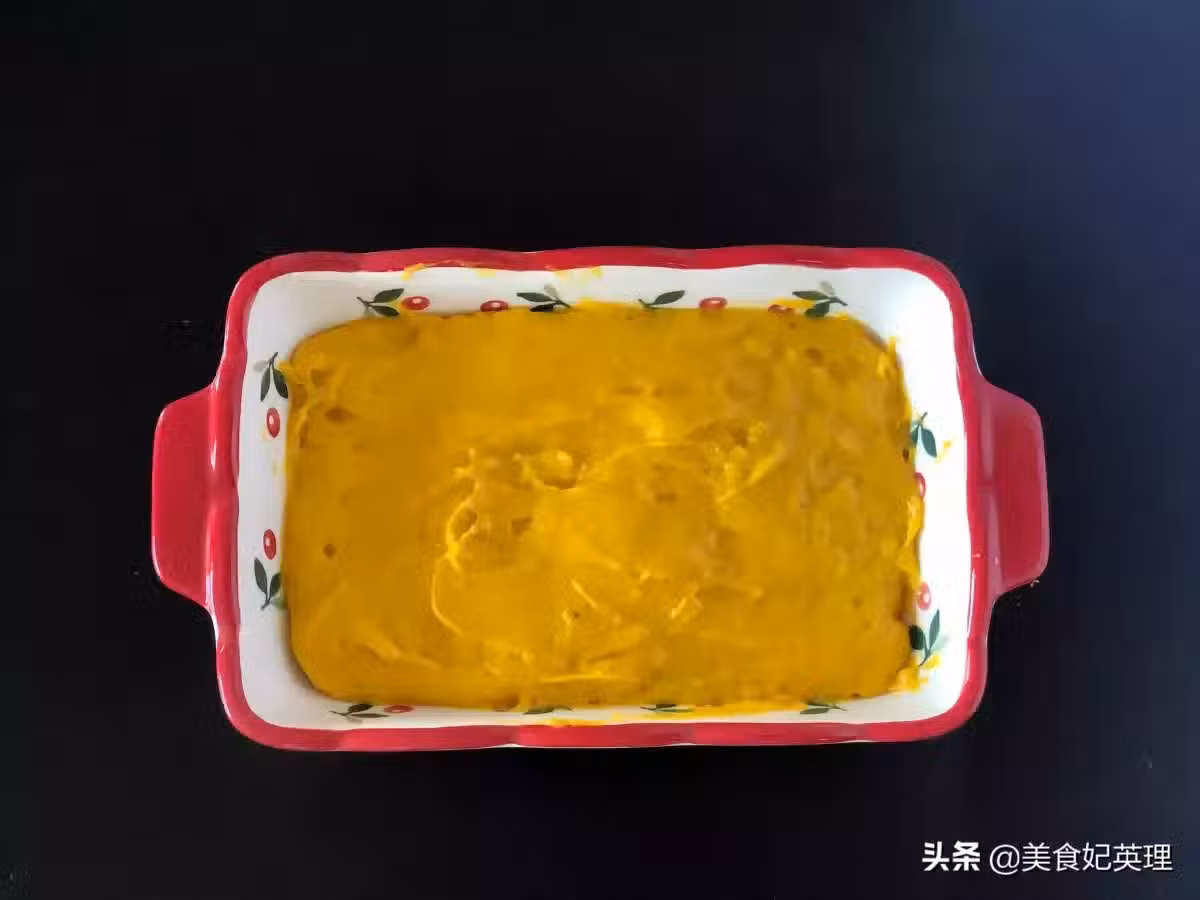 6.模具提前刷油,把炒好的南瓜泥倒入模具,晾至溫熱,覆蓋保鮮膜,入冰箱冷藏定型2小時