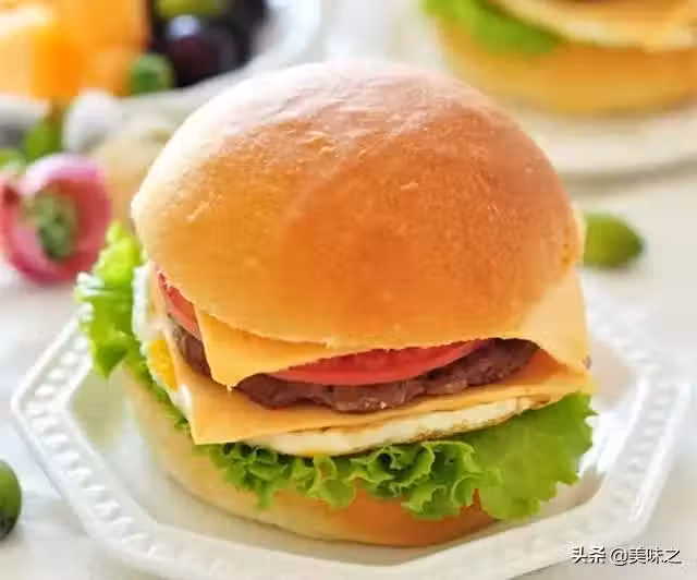 14、將西紅柿切成薄片,將西紅柿、牛肉餅、雞蛋、生菜、奶酪一同夾入麵包中即可。