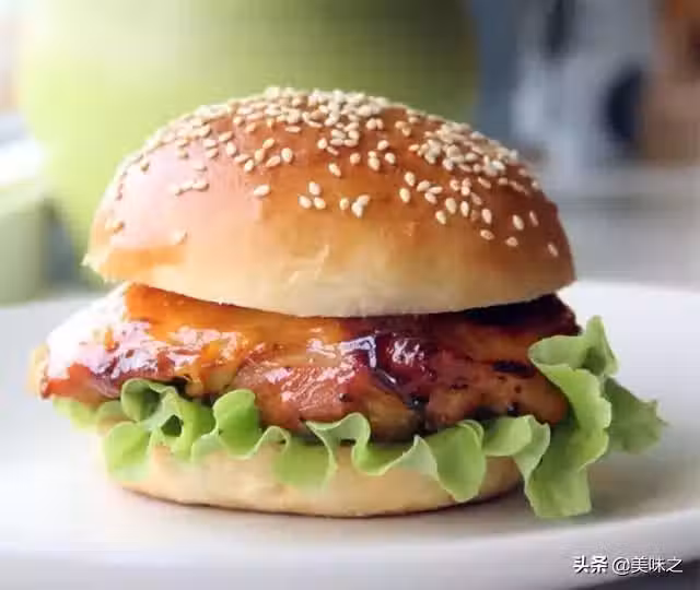 15、鋪上烤好的雞腿肉,蓋上另一半漢堡胚就完成了。