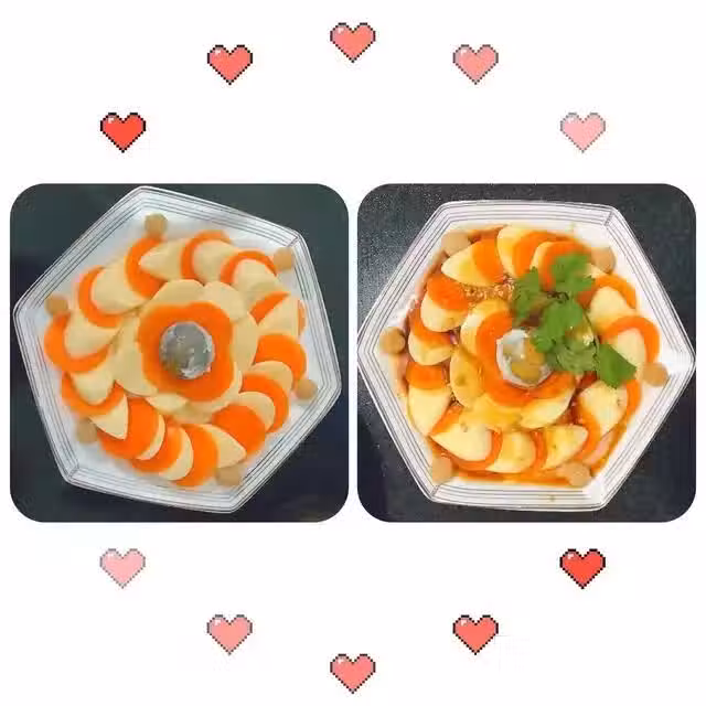 第二步,把雞蛋清加點水,打勻,淋到擺盤好的日本豆腐還有胡蘿蔔上面(記得蛋清加點水,使豆腐更嫩)