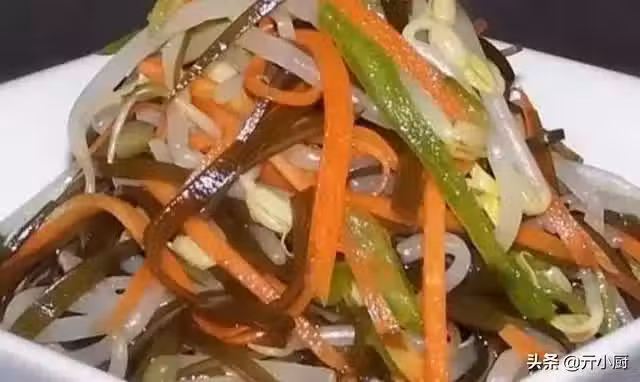 在海帶絲、豆芽、胡蘿蔔絲,青椒絲里調入鹽、生抽、醋、糖、香油拌勻即可