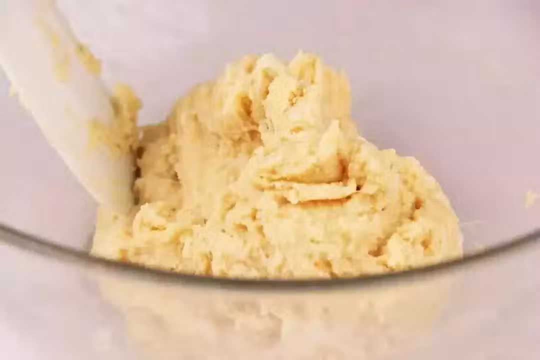將黃油融化成液體,加入麵團,攪拌均勻。