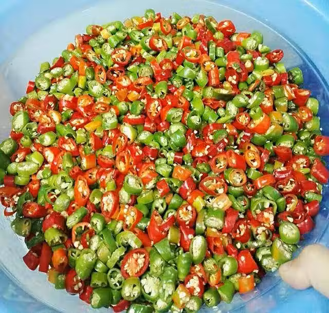 辣椒500克、食用油40克、面醬100克、白糖40克、鹽100克、白酒40克、大蒜40克、生薑40克、醋100克、味精40克、花生適量、玉米粒適量