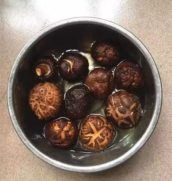 3、干香菇沖洗浮塵後加冷水浸泡。