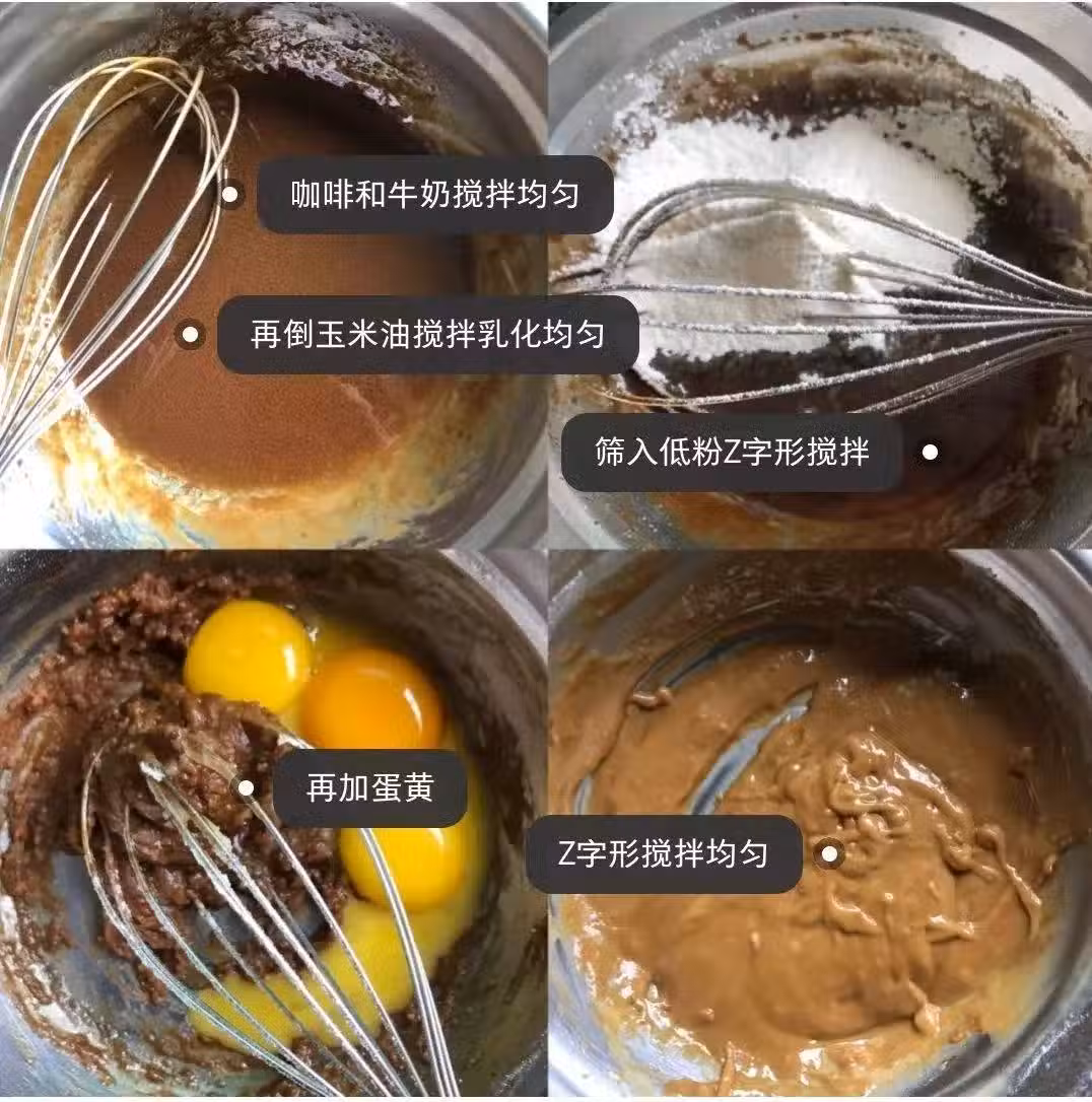 4.】模具鋪上油紙,一半蛋白霜(大約140g),加入咖啡糊中翻拌均勻,剩餘的倒入椰子糊中翻拌均勻