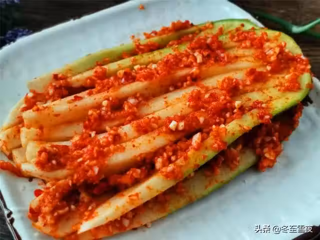 【香辣蘿蔔條鹹菜】所需材料:青蘿蔔2個、蘋果半個、細辣椒麵2湯匙、粗辣椒末2湯匙、鹽適量、姜1塊、大蒜1頭、白糖1湯匙、