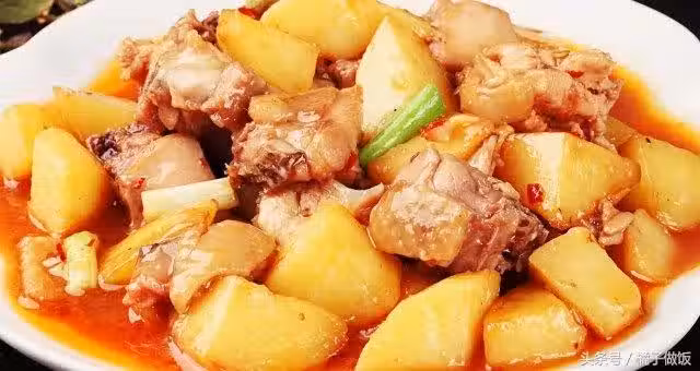 1 把去皮洗凈的土豆對半切開,再切成大塊。