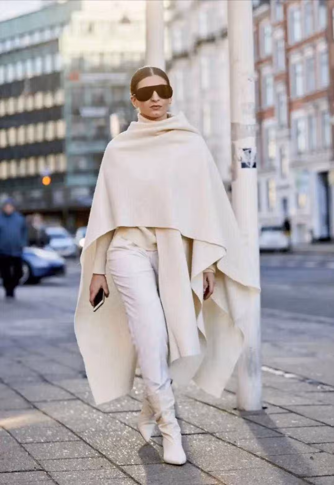 淺色系的披風搭配同色系的褲子在秋冬季節會顯得十分清爽,純白或是米白的顏色比較清新,但是這種顏色相對來講在顯瘦的效果上是比較欠缺的,如果妳身材上本身是比較骨感的類型,那麼在搭配披肩和褲子的時候可以大膽的嘗試這樣的淺色系用來呈現出與眾不同的感覺。