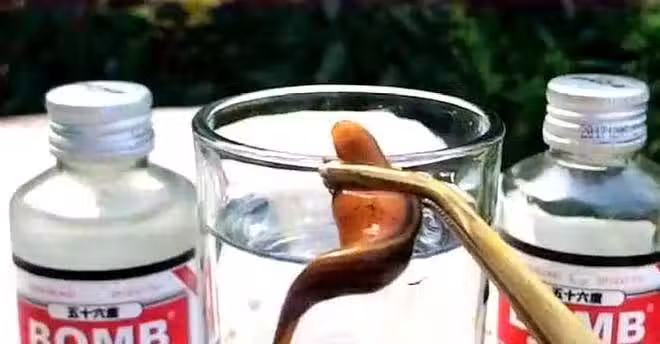 把水蛭放進56度二鍋頭中,場面瞬間失控,鏡頭記錄全過程