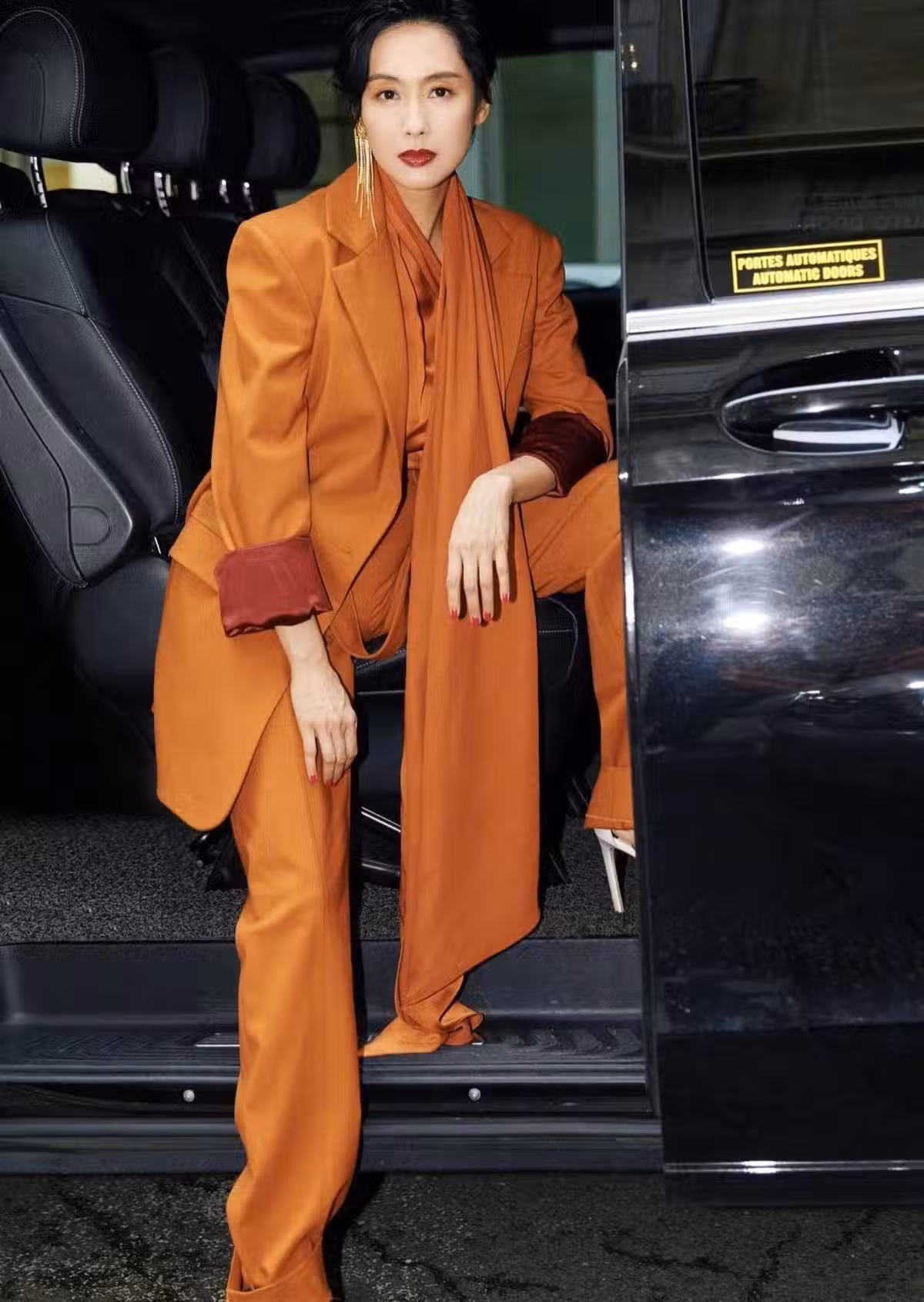 其實棕黃色的西裝套服也是一種很不錯的選擇,尤其是對於朱茵這種比較富有氣場的女性來說,選擇西裝來進行搭配能夠展露出她完美的身材,又可以讓她的身形顯得更加的挺拔,這樣能夠增添她的個人氣場。而且由於她的這款西裝剪裁比較的寬大,選擇了oversize的設計方法,這樣能夠讓朱茵的身形看上去更加的勻稱。